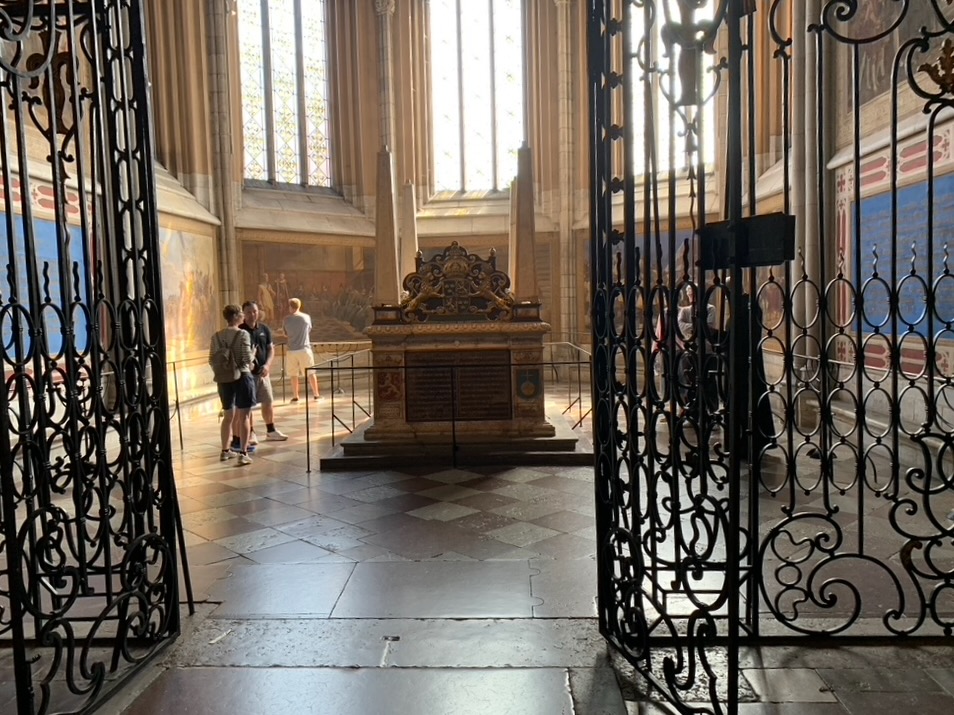 The space she beheld has the remains of Swedish King Gustav Vasa (1496-1560), founder of the Vasa Dynasty and unifier of Sweden in the 16th century. Three stone effigies—his and on either side of him those of two of his three wives—all lie atop his sarcophagus, which was designed by Flemish artist Willem Boy. Seven frescoes on the curved wall depict scenes from the King’s life. Uppsala Cathedral is also the burial site for other royalty and famous Swedes.