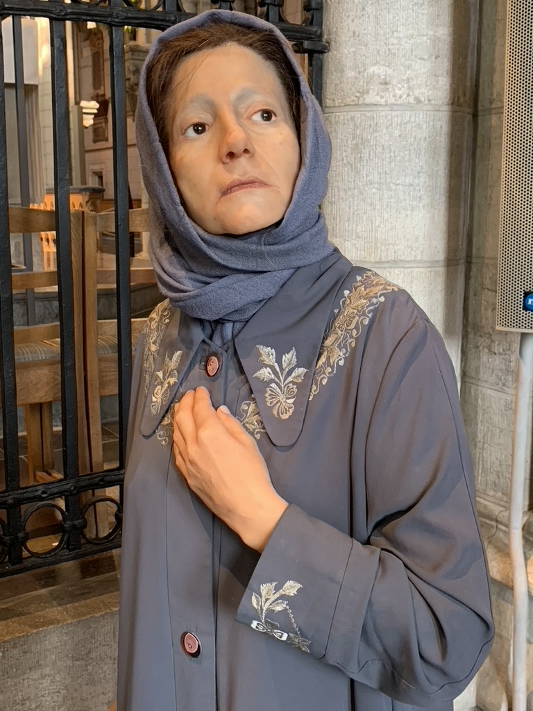 The “tourist” remained motionless for too long than is humanly possible. She is, I learned later, a remarkably lifelike, life-size reproduction of a woman, constructed of polyester, silicone, fabric, glass, human hair, and oils. Her hair partially covered by a blue shawl, she wears black boots, a blue coat with white floral embroidery, and a white skirt.