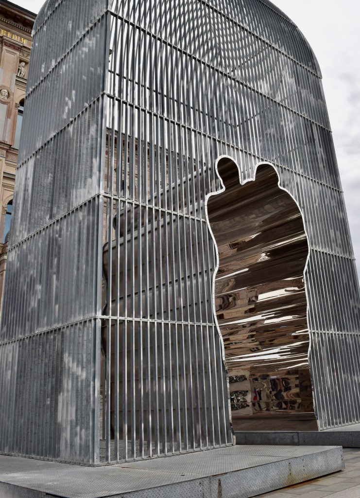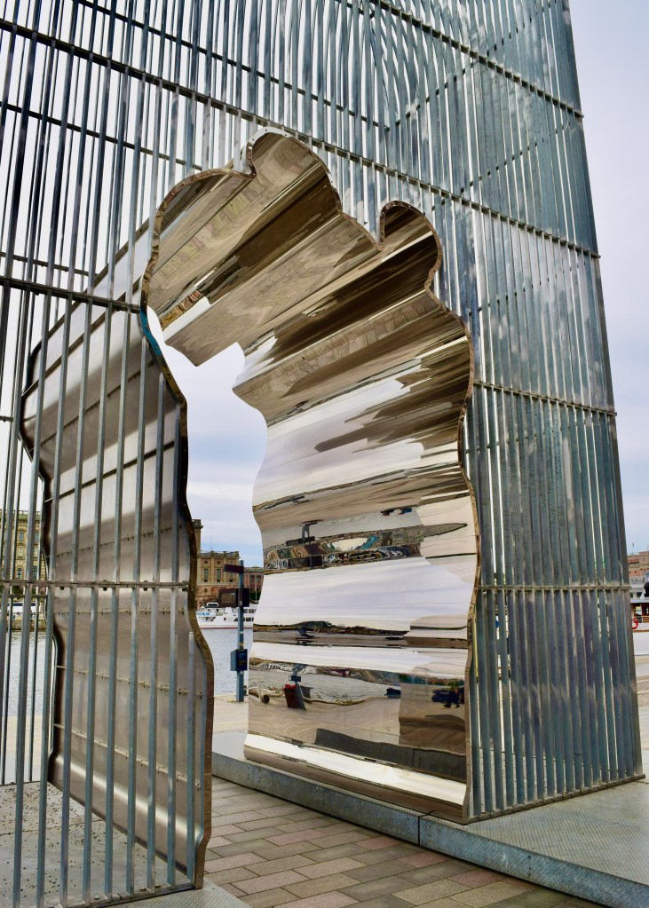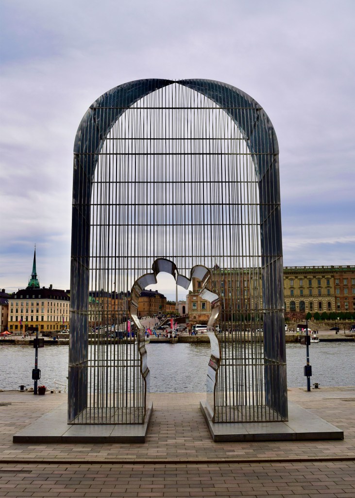 In Stockholm, between Nationalmuseum (the Swedish national gallery of fine arts) and the Nybroviken Bay waterfront, where tourists board and exit ferries and sightseeing boats, or sip a beer while enjoying the view, rises a gleaming stainless steel 40-foot tall arch.