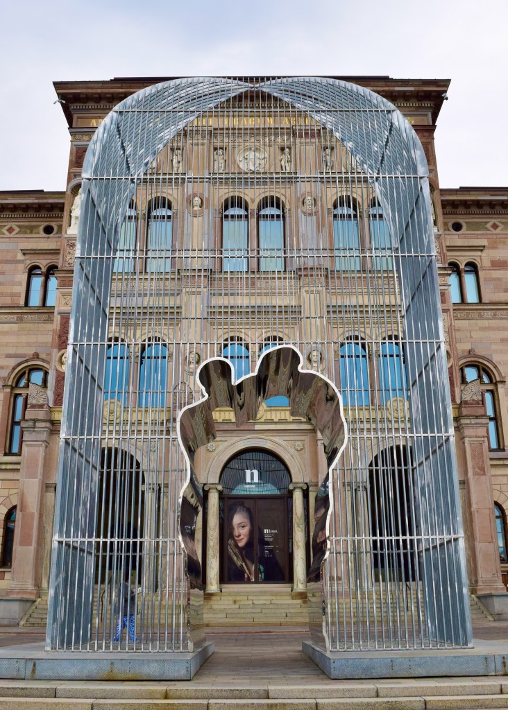 Created by Chinese artist and human rights activist Ai Weiwei, the artwork, entitled simply “Arch,” resembles a cage with a curved top, its inner walkway shaped like a silhouette of two people embracing.